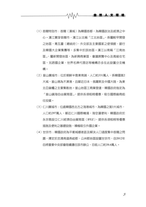 (1) 首爾特別市:首爾(漢城)為韓國首都,為韓國政治及經濟之中