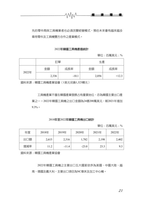 業之一。2022年韓國工具機之出口金額為24億200萬美元,較2021年增加