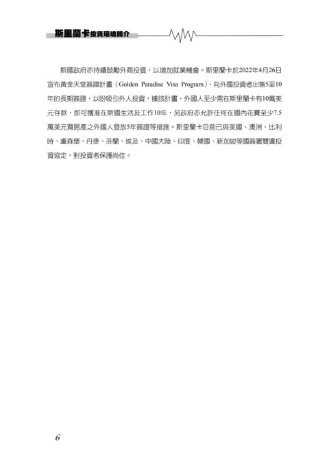 萬美元買房產之外國人發放5年簽證等措施。斯里蘭卡目前已與美國、澳洲、比利