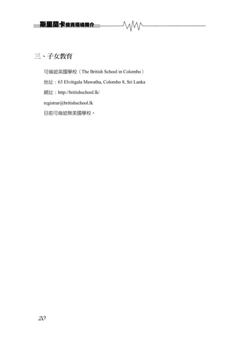 斯里蘭卡投資環境簡介 三、子女教育 可倫坡英國學校(The British School in Colombo) 地址:63 Elvitigala Mawatha, Colombo 8, Sri Lanka 網址:http://britishschool.lk/ registrar@britishschool.lk 目前可倫坡無美國學校。 20