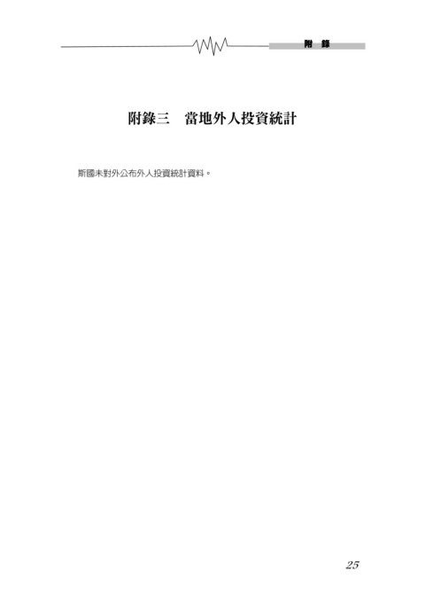 附 錄 附錄三 當地外人投資統計 斯國未對外公布外人投資統計資料。 25