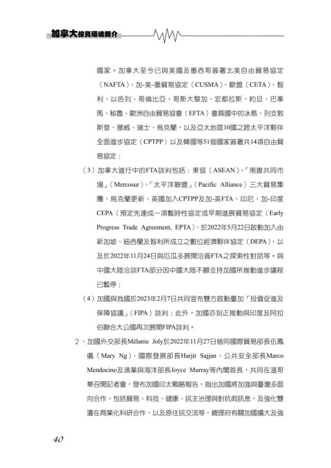保障協議」(FIPA)談判;此外,加國亦刻正推動與印度及阿拉