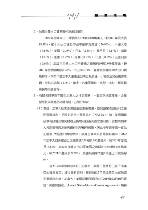 易夥伴。2022年度加拿大主要出口項目為原油、小客車及其他載客車