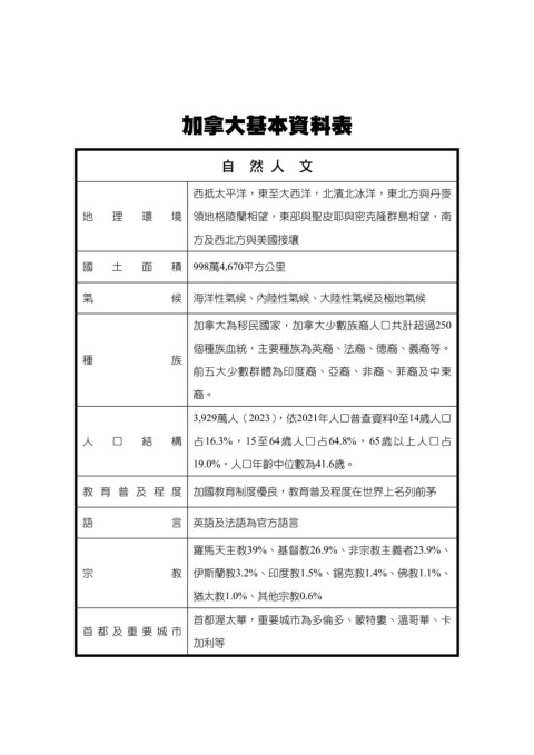 首都渥太華,重要城市為多倫多、蒙特婁、溫哥華、卡
