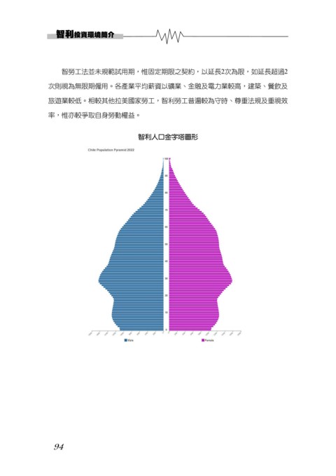 智利投資環境簡介 智勞工法並未規範試用期,惟固定期限之契約,以延長2次為限,如延長超過2 次則視為無限期僱用。各產業平均薪資以礦業、金融及電力業較高,建築、餐飲及 旅遊業較低。相較其他拉美國家勞工,智利勞工普遍較為守時、尊重法規及重視效 率,惟亦較爭取自身勞動權益。 智利人口金字塔圖形 94