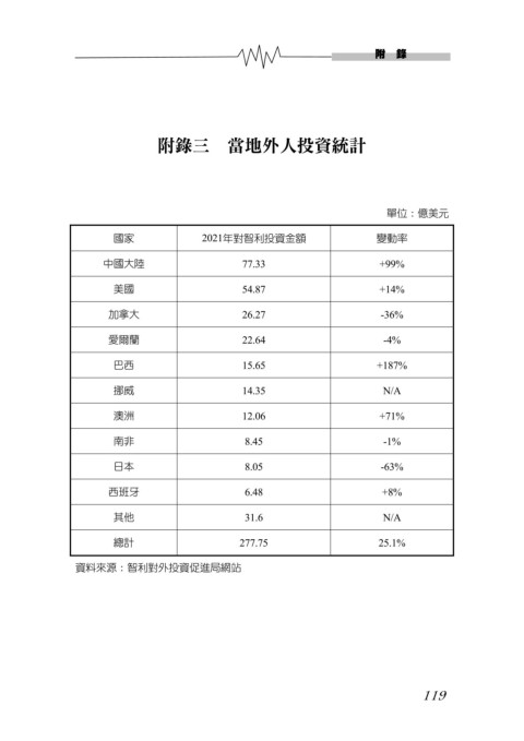 附 錄 附錄三 當地外人投資統計 單位:億美元 國家 2021年對智利投資金額 變動率 中國大陸 77.33 +99% 美國 54.87 +14% 加拿大 26.27 -36% 愛爾蘭 22.64 -4% 巴西 15.65 +187% 挪威 14.35 N/A 澳洲 12.06 +71% 南非 8.45 -1% 日本 8.05 -63% 西班牙 6.48 +8% 其他 31.6 N/A 總計 277.75 25.1% 資料來源:智利對外投資促進局網站 119