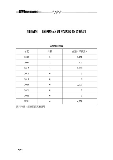 智利投資環境簡介 附錄四 我國廠商對當地國投資統計 年度別統計表 年度 件數 金額(千美元) 2003 2 1,131 2007 1 200 2017 1 1,000 2018 0 0 2019 0 0 2020 0 2,000 2021 0 0 2022 0 0 總計 4 4,331 資料來源:經濟部投資審議司 120