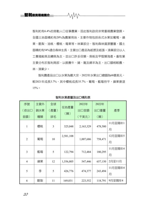 果、酪梨、油桃、櫻桃、莓果等。林業部分,智利森林資源豐富,國土