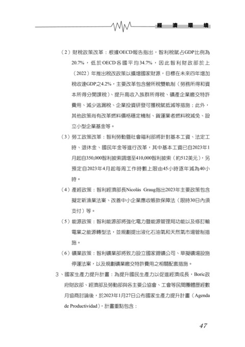 (4)產經政策:智利經濟部長Nicolás Graug指出2023年主要政策包含