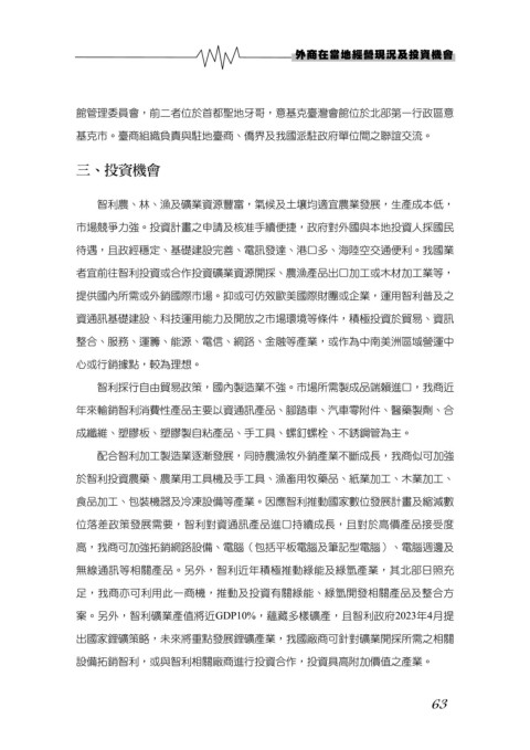 者宜前往智利投資或合作投資礦業資源開採、農漁產品出口加工或木材加工業等,