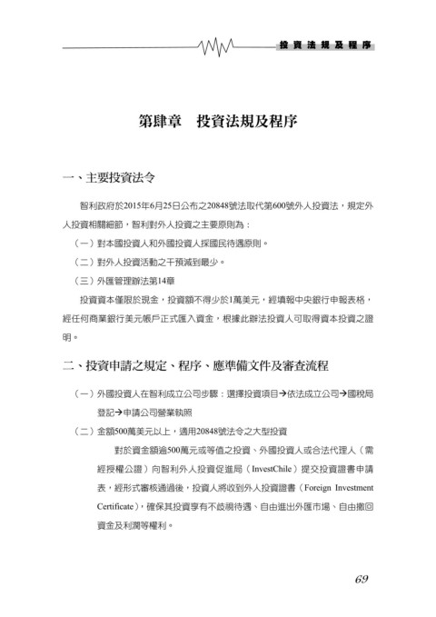 人投資相關細節,智利對外人投資之主要原則為: