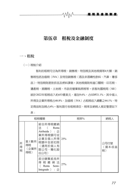 定商品附加稅占4%。智利現行各租稅項目、稅率及納稅人規定整理如下