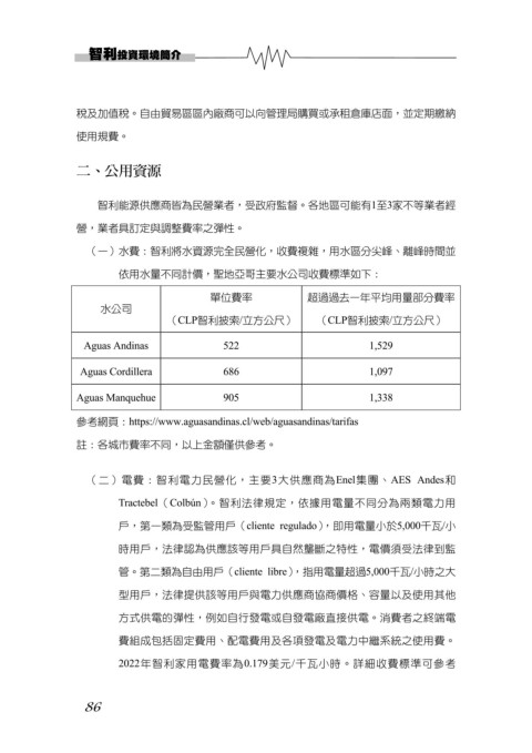 (一)水費:智利將水資源完全民營化,收費複雜,用水區分尖峰、離峰時間並