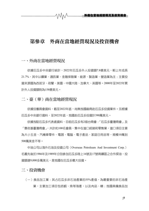 依據投審員會資料,截至2022年底,尚無我國廠商赴厄瓜多投資案件。另根據