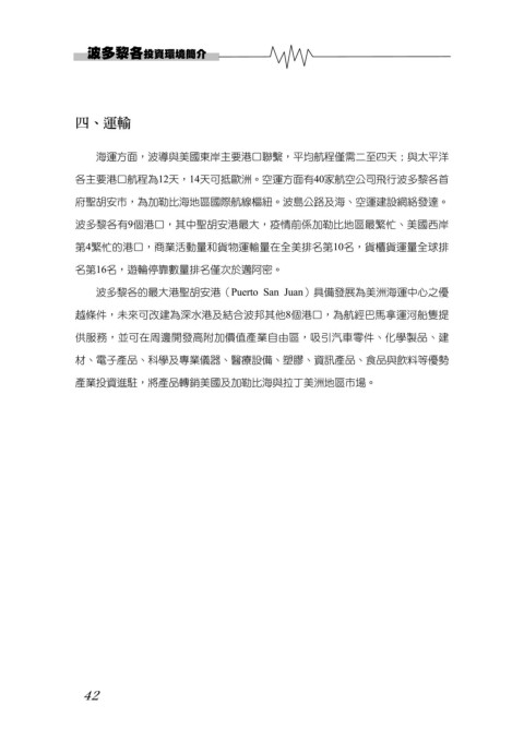 各主要港口航程為12天,14天可抵歐洲。空運方面有40家航空公司飛行波多黎各首