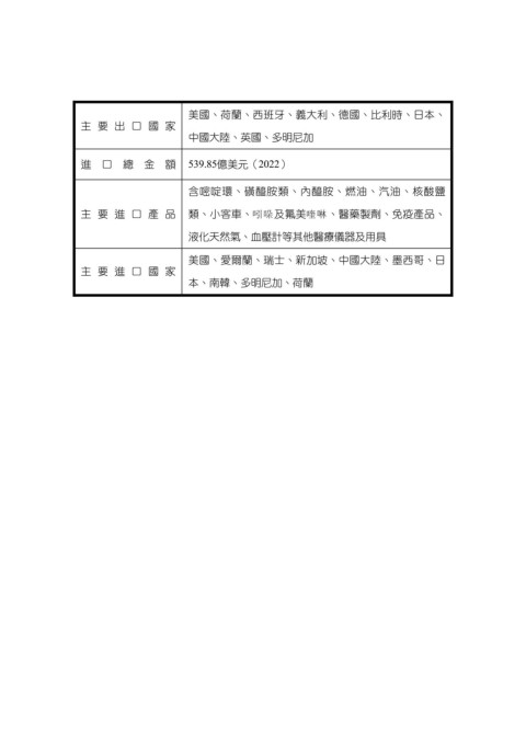 美國、荷蘭、西班牙、義大利、德國、比利時、日本、 主要出口國家 中國大陸、英國、多明尼加 進口總金額 539.85億美元(2022) 含嘧啶環、磺醯胺類、內醯胺、燃油、汽油、核酸鹽 主要進口產品 類、小客車、 吲吲及氟美 喹喹、醫藥製劑、免疫產品、 液化天然氣、血壓計等其他醫療儀器及用具 美國、愛爾蘭、瑞士、新加坡、中國大陸、墨西哥、日 主要進口國家 本、南韓、多明尼加、荷蘭