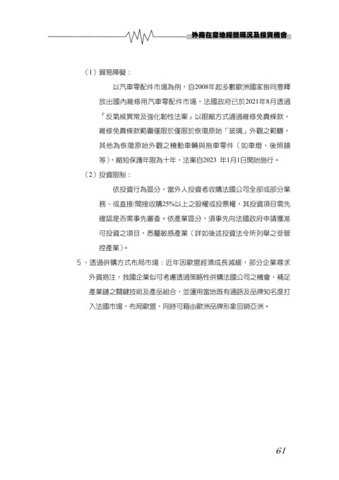 外資挹注,我國企業似可考慮透過策略性併購法國公司之機會,補足