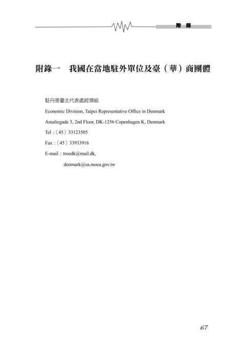 附 錄 附錄一 我國在當地駐外單位及臺(華)商團體 駐丹麥臺北代表處經濟組 Economic Division, Taipei Representative Office in Denmark Amaliegade 3, 2nd Floor, DK-1256 Copenhagen K, Denmark Tel:(45)33123505 Fax:(45)33933916 E-mail:troedk@mail.dk, denmark@sa.moea.gov.tw 67