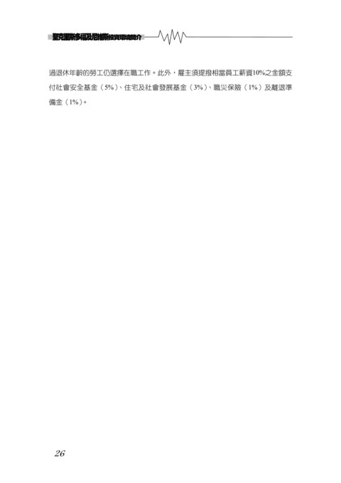投資環境簡介 過退休年齡的勞工仍選擇在職工作。此外,雇主須提撥相當員工薪資10%之金額支 付社會安全基金(5%)、住宅及社會發展基金(3%)、職災保險(1%)及離退準 備金(1%)。 26