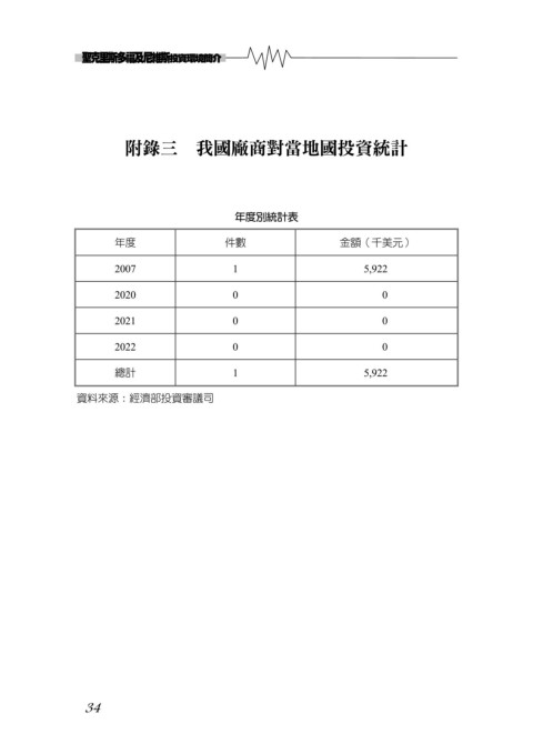 投資環境簡介 附錄三 我國廠商對當地國投資統計 年度別統計表 年度 件數 金額(千美元) 2007 1 5,922 2020 0 0 2021 0 0 2022 0 0 總計 1 5,922 資料來源:經濟部投資審議司 34