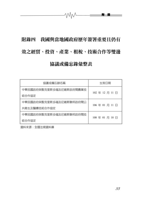 附 錄 附錄四 我國與當地國政府歷年簽署重要且仍有 效之經貿、投資、產業、租稅、技術合作等雙邊 協議或備忘錄彙整表 協議或備忘錄名稱 生效日期 中華民國政府與聖克里斯多福及尼維斯政府間農業技 102 年 12 月 11 日 術合作協定 中華民國政府與聖克里斯多福及尼維斯聯邦政府間公 106 年 01 月 11 日 共衛生及醫療技術合作協定 中華民國政府與聖克里斯多福及尼維斯聯邦政府間技 108 年 01 月 18 日 術合作協定 資料來源:全國法規資料庫 35