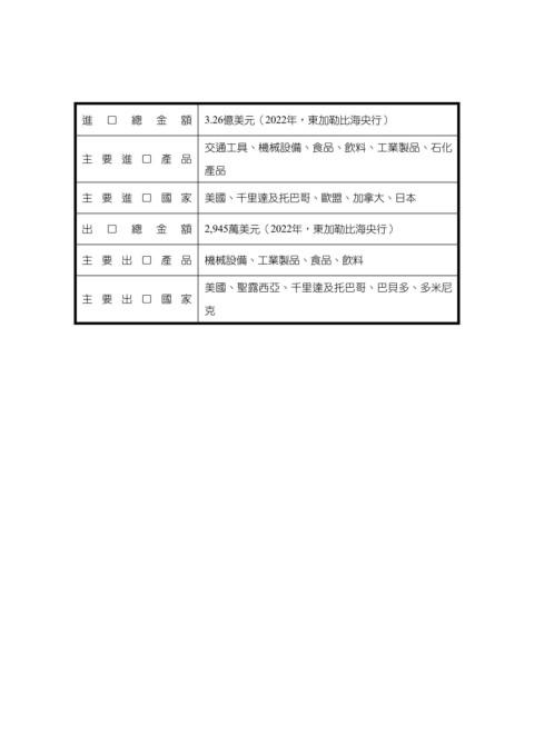 進 口 總 金 額 3.26億美元(2022年,東加勒比海央行) 交通工具、機械設備、食品、飲料、工業製品、石化 主要進口產品 產品 主要進口國家 美國、千里達及托巴哥、歐盟、加拿大、日本 出 口 總 金 額 2,945萬美元(2022年,東加勒比海央行) 主要出口產品 機械設備、工業製品、食品、飲料 美國、聖露西亞、千里達及托巴哥、巴貝多、多米尼 主要出口國家 克