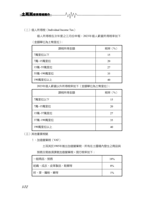 2023年個人薪資以外所得稅率如下(金額單位為土幣里拉):