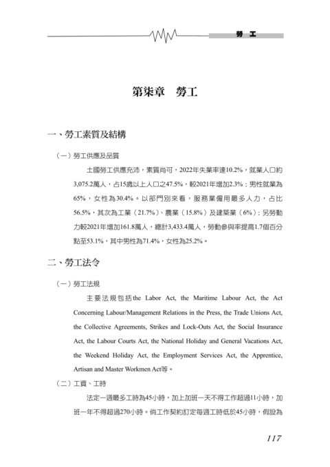 土國勞工供應充沛,素質尚可,2022年失業率達10.2%,就業人口約