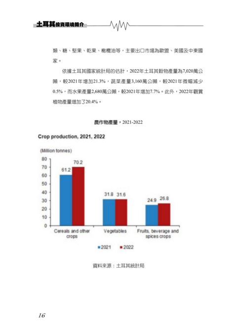 土耳其投資環境簡介 類、糖、堅果、乾果、橄欖油等,主要出口市場為歐盟、美國及中東國 家。 依據土耳其國家統計局的估計,2022年土耳其穀物產量為7,020萬公 噸,較2021年增加21.3%,蔬菜產量3,160萬公噸,較2021年微幅減少 0.5%,而水果產量2,680萬公噸,較2021年增加7.7%。此外,2022年觀賞 植物產量增加了20.4%。 農作物產量,2021-2022 資料來源:土耳其統計局 16