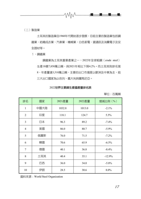 鋼鐵業為土耳其重要產業之一,2022年全球粗鋼(crude steel)