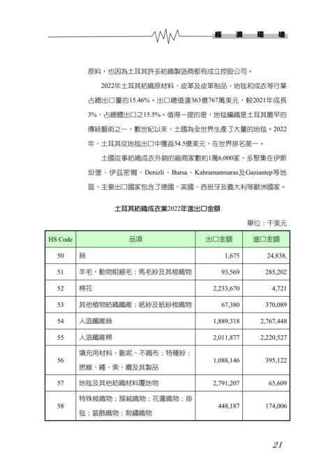 2022年土耳其紡織原材料、皮革及皮革制品、地毯和成衣等行業