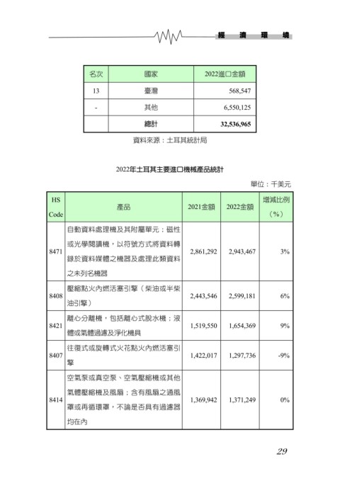2022年土耳其主要進口機械產品統計