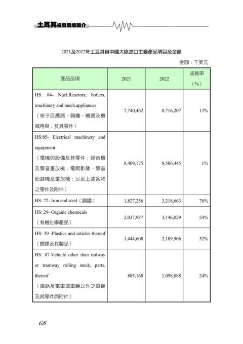 2021及2022年土耳其自中國大陸進口主要產品項目及金額