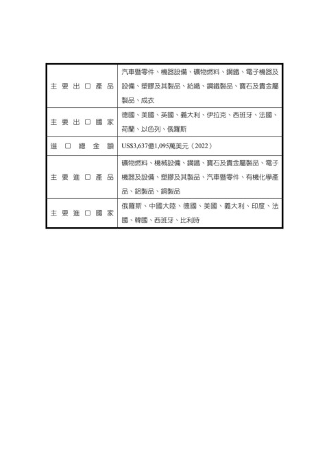 主要出口產品 設備、塑膠及其製品、紡織、鋼鐵製品、寶石及貴金屬