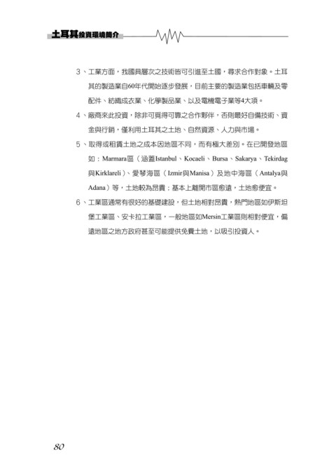 3、工業方面,我國具層次之技術皆可引進至土國,尋求合作對象。土耳