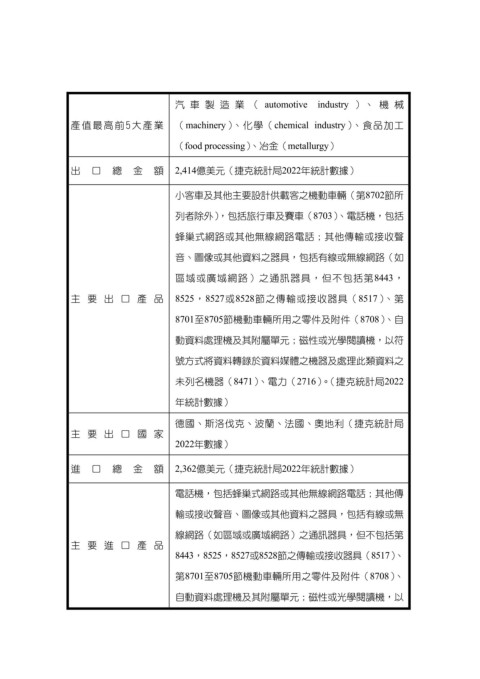 出 口 總 金 額 2,414億美元(捷克統計局2022年統計數據)