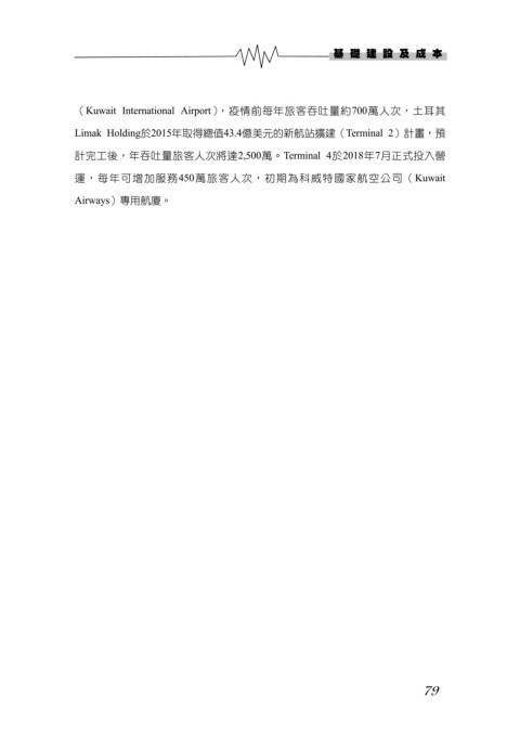 基礎建設及成本 (Kuwait International Airport),疫情前每年旅客吞吐量約700萬人次,土耳其 Limak Holding於2015年取得總值43.4億美元的新航站擴建(Terminal 2)計畫,預 計完工後,年吞吐量旅客人次將達2,500萬。Terminal 4於2018年7月正式投入營 運,每年可增加服務450萬旅客人次,初期為科威特國家航空公司(Kuwait Airways)專用航廈。 79