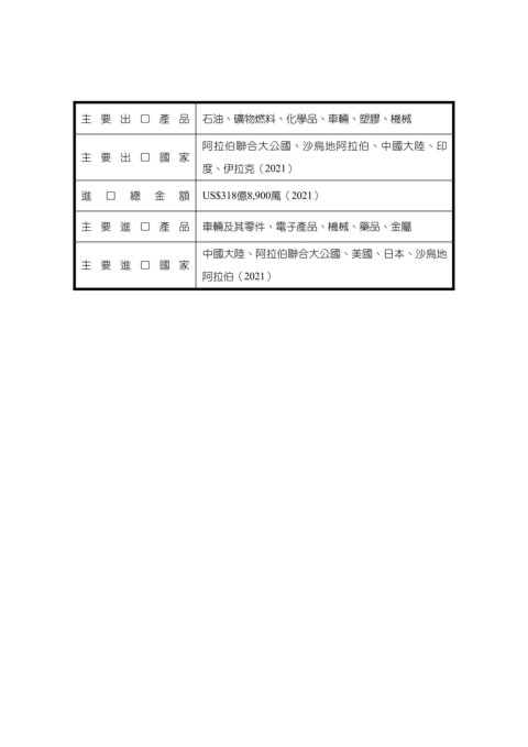 主要出口產品 石油、礦物燃料、化學品、車輛、塑膠、機械 阿拉伯聯合大公國、沙烏地阿拉伯、中國大陸、印 主要出口國家 度、伊拉克(2021) 進 口 總 金 額 US$318億8,900萬(2021) 主要進口產品 車輛及其零件、電子產品、機械、藥品、金屬 中國大陸、阿拉伯聯合大公國、美國、日本、沙烏地 主要進口國家 阿拉伯(2021)