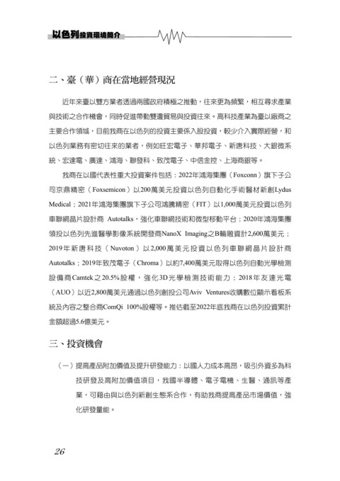主要合作領域,目前我商在以色列的投資主要係入股投資,較少介入實際經營,和