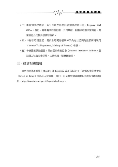 (Invest in Israel)作為外人投資單一窗口,可至其官網查詢赴以色列投資相關資