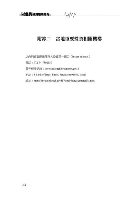 以色列投資環境簡介 附錄二 當地重要投資相關機構 以色列經濟產業部外人投資單一窗口(Invest in Israel) 電話:972-74-7502550 電子郵件信箱:InvestInIsrael@economy.gov.il 地址:5 Bank of Israel Street, Jerusalem 91036, Israel 網址:https://investinisrael.gov.il/Portal/Pages/contactUs.aspx 54