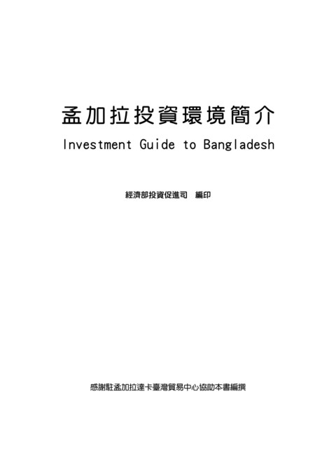 孟加拉投資環境簡介 Investment Guide to Bangladesh 經濟部投資促進司 編印 感謝駐孟加拉達卡臺灣貿易中心協助本書編撰