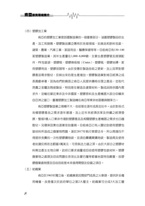 求外,並輸往鄰近東非及中非國家。塑膠原料及生產機器大部分仰賴來