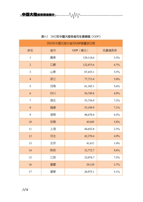 表3-2 2022年中國大陸各省市生產總值(GDP)